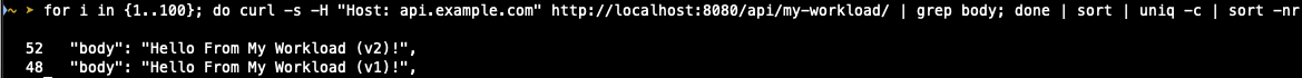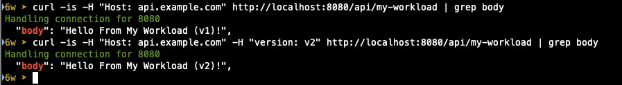 $ curl -is -H "Host: api.example.com" -H "version: v2" http://localhost:8080/api/my-workload | grep body